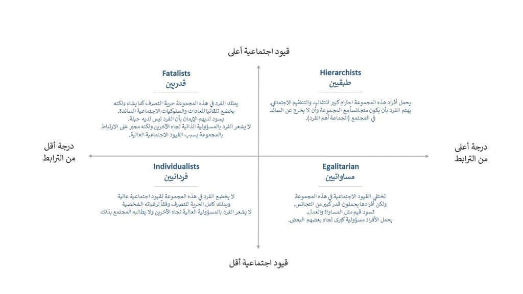 قسمت دوقلاس هذه التصورات إلى ٤ أقسام بناء على معيارين: الأول هو مقدار القيود الاجتماعية التي تفرضها المجموعة على أفرادها، والثاني مقدار الترابط والتجانس بين أفراد المجموعة:
