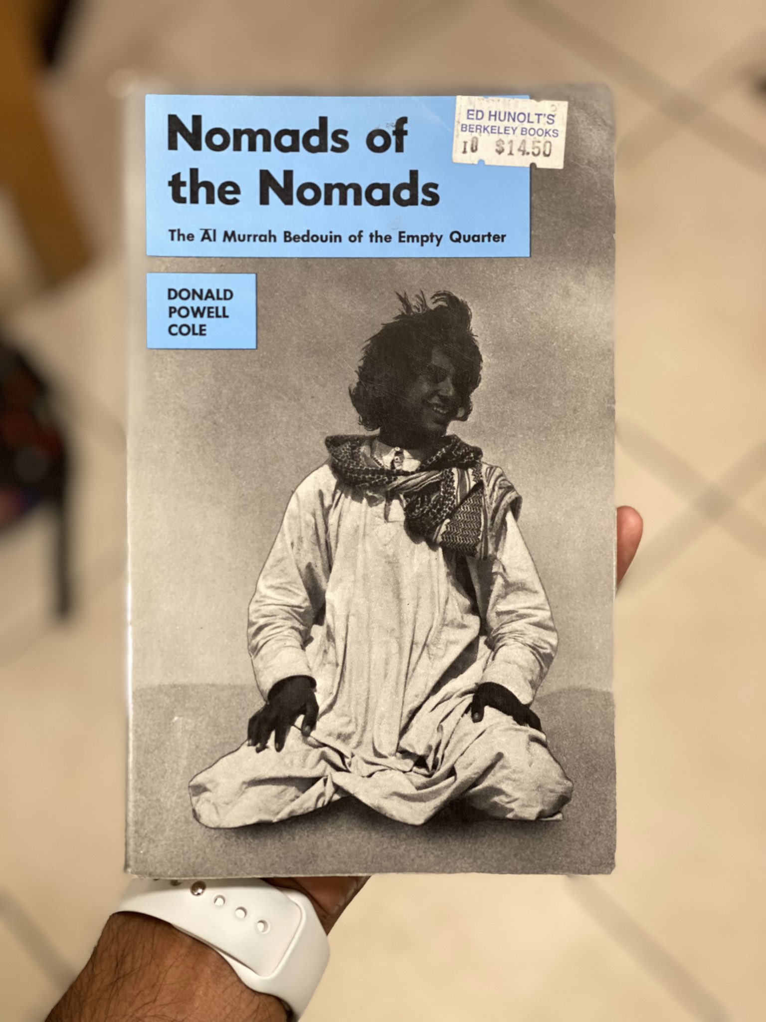 من أجمل ما قرأت مؤخراً كتاب بعنوان “بدو البدو”، وهو عبارة عن بحث ميداني قام به الأنثروبولوجي دونالد كول عن فرع العذبة من قبيلة آل مرة، والذين كانت ديارهم تقع في منطقة نائية في وسط الربع الخالي، وبسبب عزلتهم الشديدة عن التجمعات البشرية الأخرى وصفهم الباحث بأنهم (بدو البدو). قدم كول إلى المملكة في ١٩٦٨Continue reading “كتاب: بدو البدو”